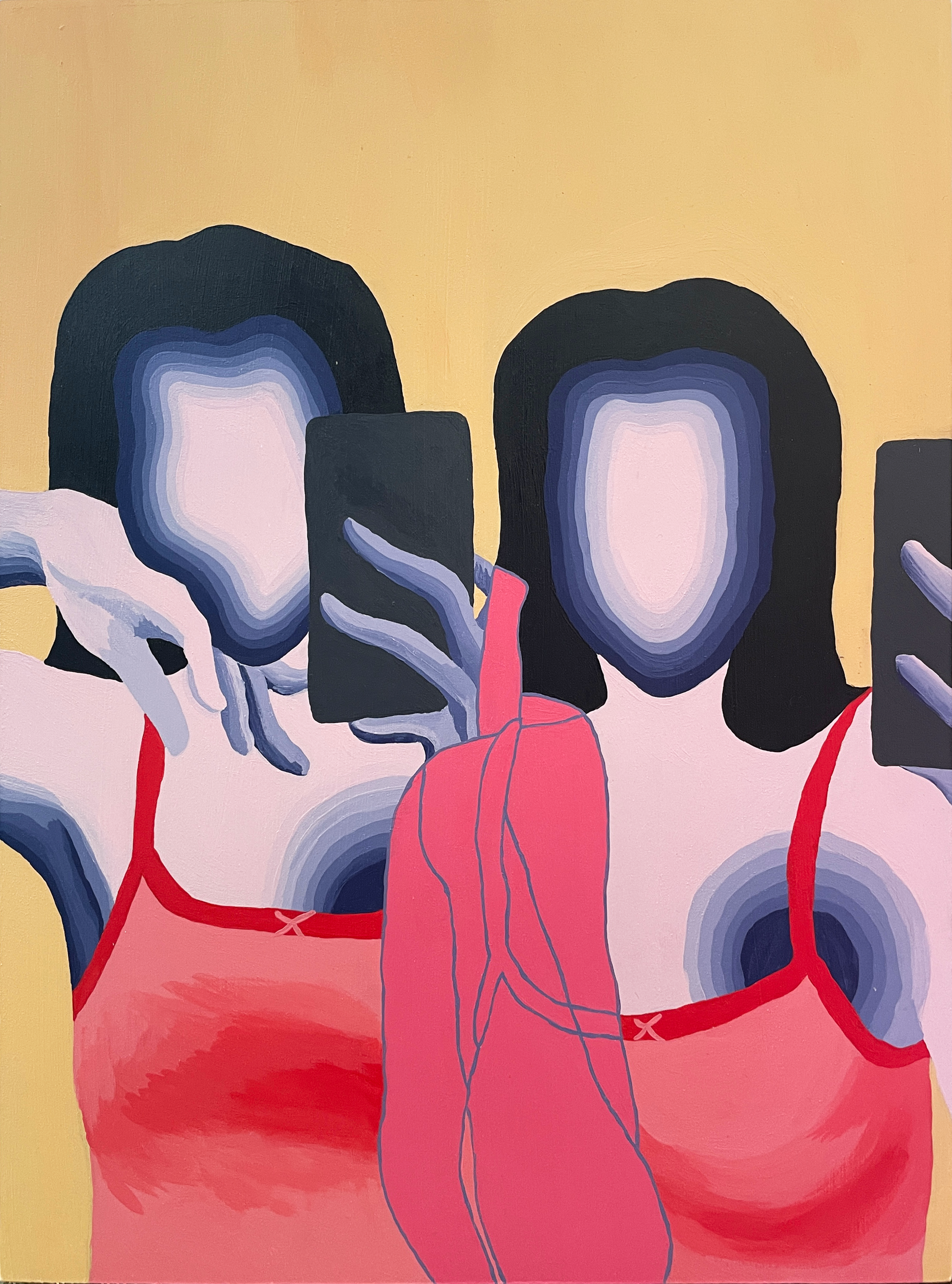 I disfigure myself in Photoshop and translate the result into acrylic paintings on wood. By moving these distortions into the physical realm, I cement them in reality and thus suggest that all of these perceptions of myself are true. The physicality of the paintings removes them from the digital, malleable world of social media, allowing me to hold a spotlight to its volatile nature.